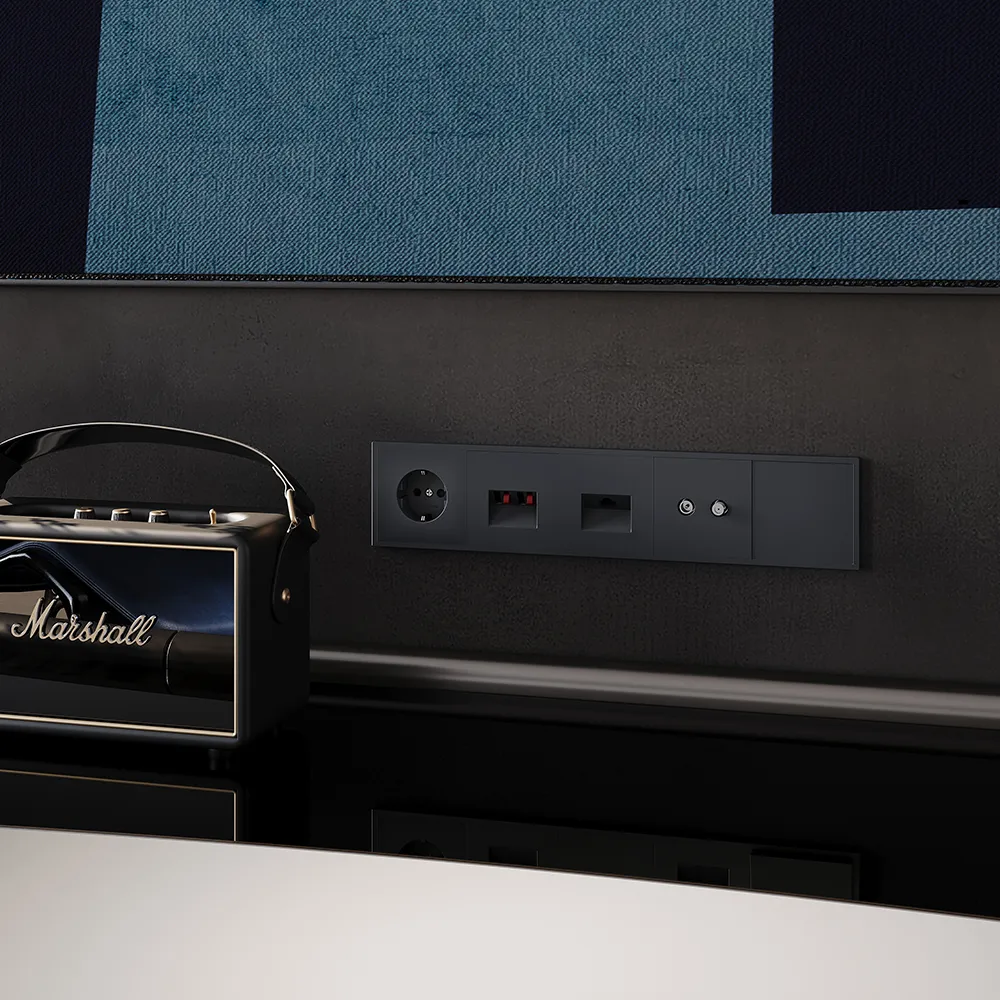 Розетка легко комбинируется с другими устройствами серии — например, можно разместить рядом электрическую розетку для питания ТВ и USB-порт для приставки в одной рамке, создав функциональный и стильный блок управления.